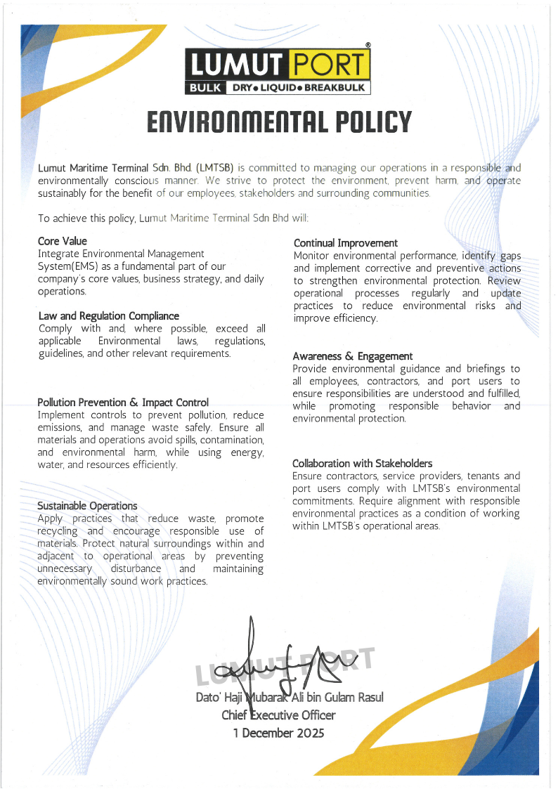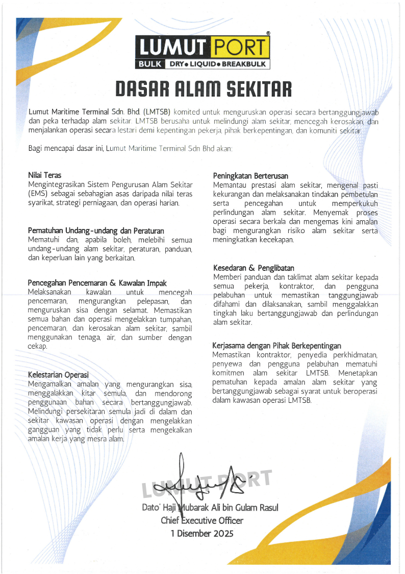 Lumut Maritime Terminal Sdn Bhd (LMTSB) is committed to managing our operations in a responsible and environmentally conscious manner. We strive to protect the environment, prevent harm, and operate sustainably for the benefit of our employees, stakeholders and surrounding communities.